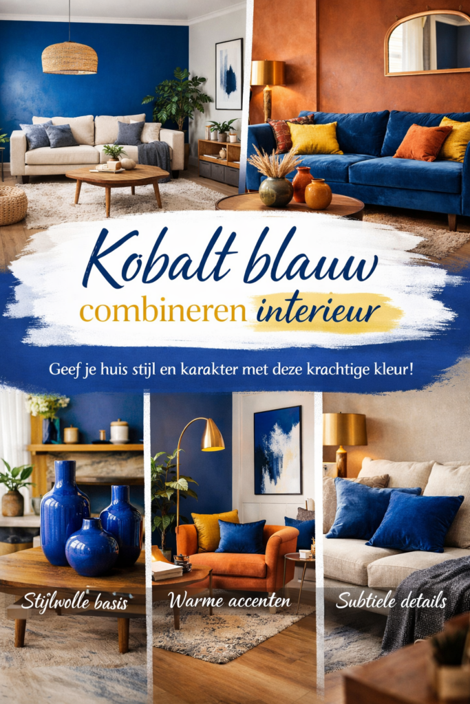 Wil je meer spanning en warmte creëren, dan kun je kobalt blauw combineren met warme kleuren zoals okergeel, terracotta of roesttinten. Deze contrasten zorgen voor een speels en eigentijds interieur dat direct uitnodigend aanvoelt.